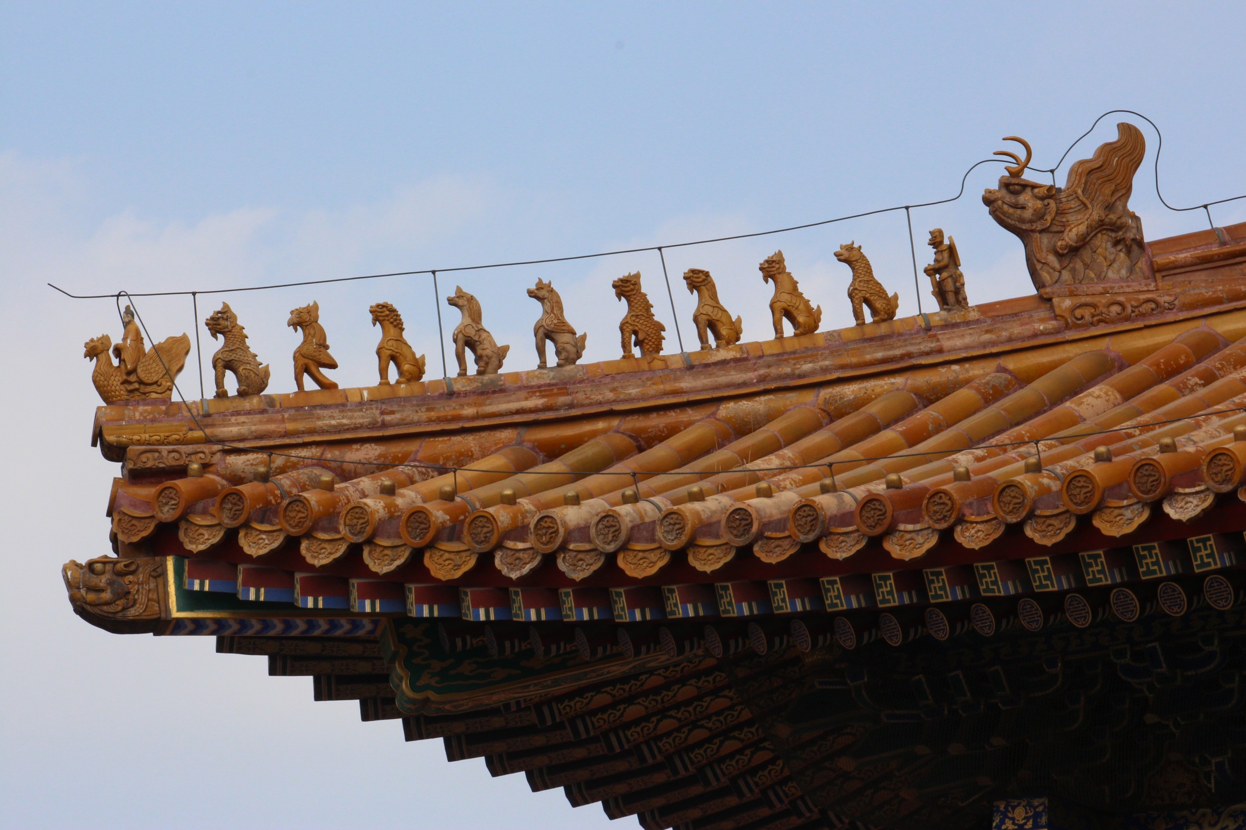 You might also recall from an early blog the symbolism of roof decorations. The number of statuettes or characters represents the status of a building. A minor building or a home outside the palace might have 3 to 5. The Hall of Supreme Harmony has 10 and was the only building in the country permitted to have that many.