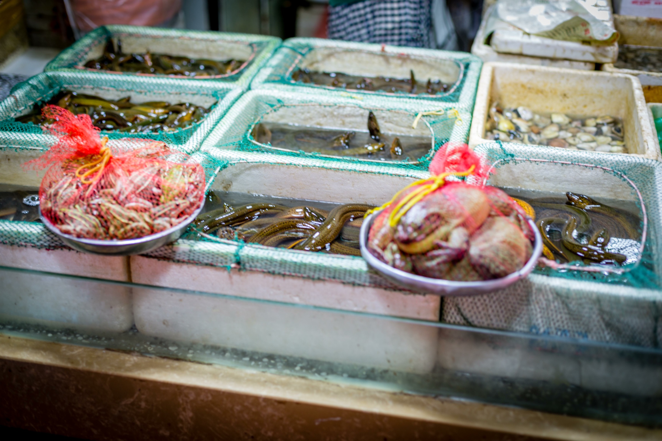 Live eels and pan of frogs